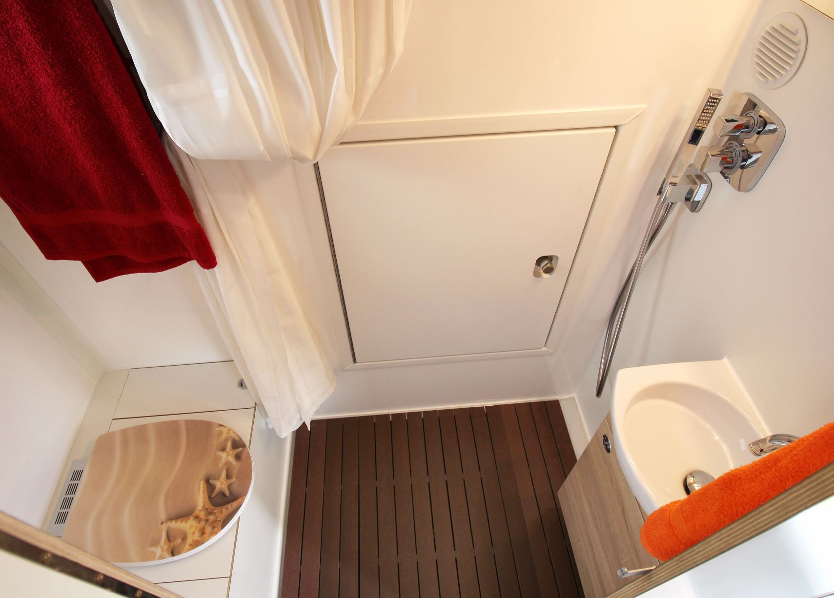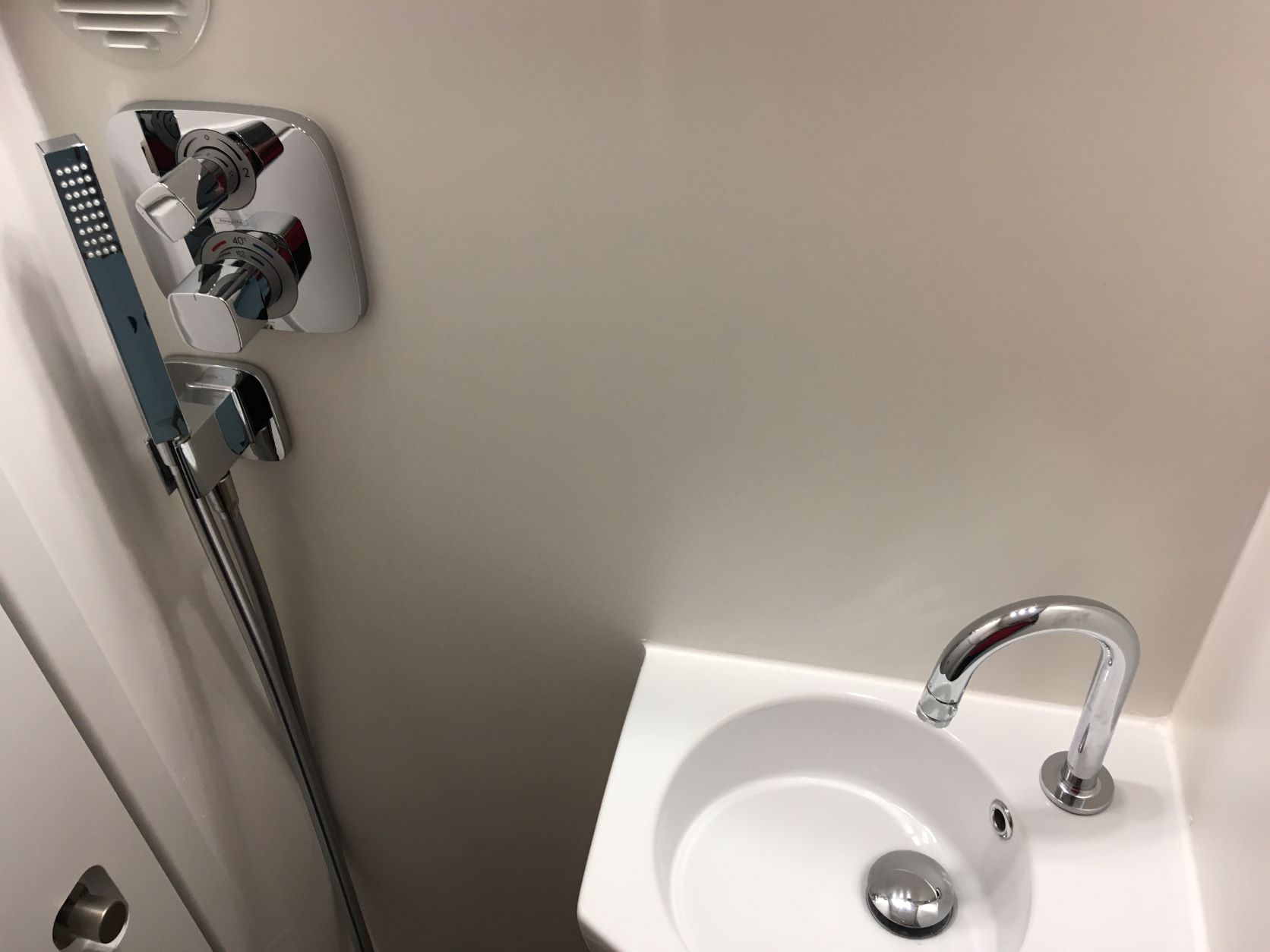 Jede Komponente eines Systems ist auch eine potentielle Schwachstelle. Daher wollte ich gerade im Wassersystem die Anzahl der Verschlüsse, Anschlüsse und Leitungen so gering wie möglich halten. Im Bad habe ich daher eine Standard-Mischbatterie verbaut. Hier kann man die Temperatur vorwählen und Dusche und Waschbecken ansteuern. D.h. wir brauchen keine weitere Armatur für das Waschbecken. Das spart auch Platz, denn das Becken ist schon ziemlich klein. Die vorgewählte Temperatur wird so gut wie nie verstellt, sie passt für Beides.
