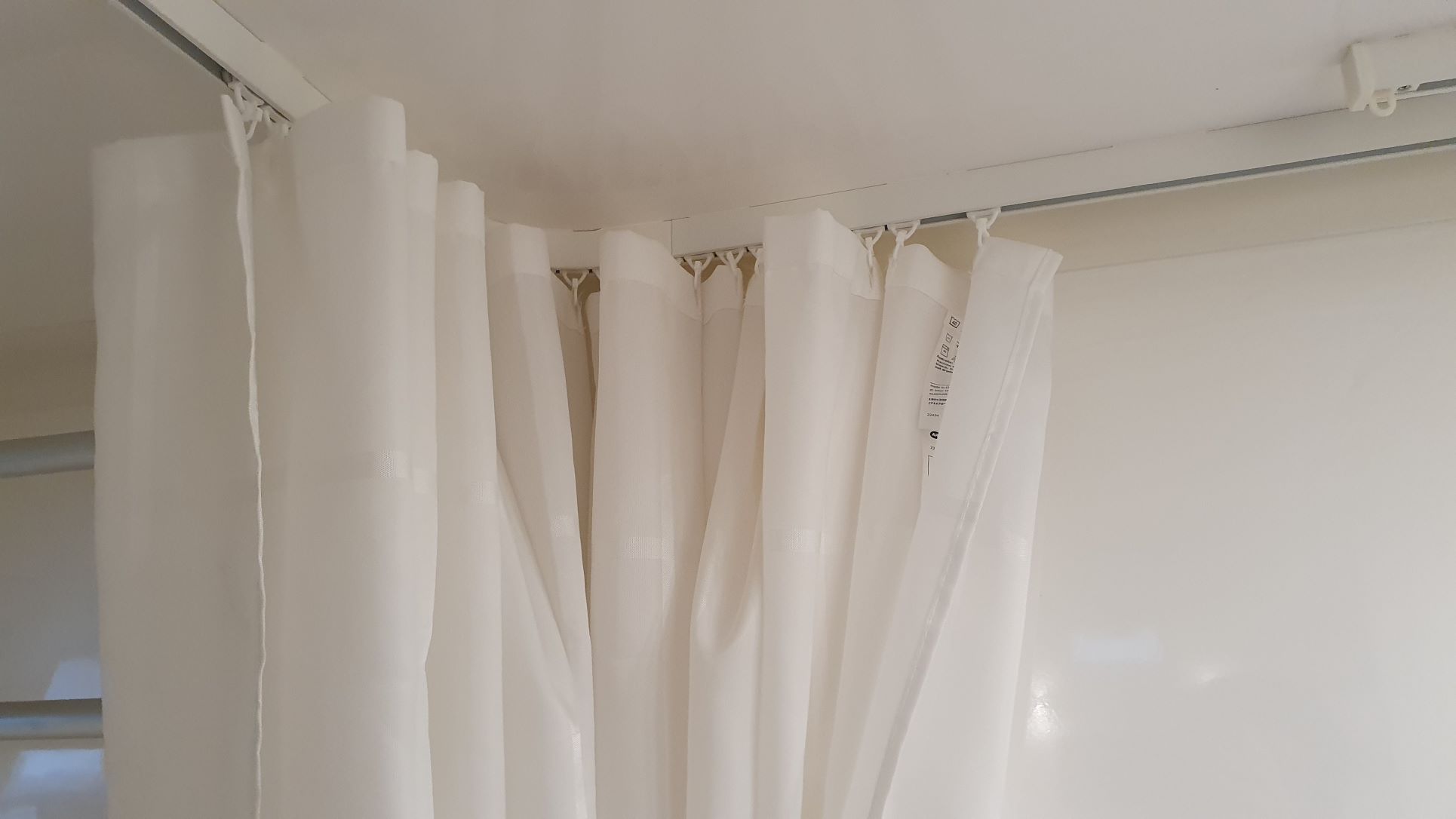 Komfortabel sollte es in einem Langzeitreisemobil schon sein. Schließlich muss man es auch mal längere Zeit in dem kleinen Raum aushalten können. Und zum Komfort zählt auch ein Bad, in den man sich nicht vorkommt, wie eine Sardine in der Dose. Also haben wir unseren Wellnessbereich ein wenig größer geplant. Durch das zusammenlegen von Toilette und Dusche zu einem Raum, hat man mehr Platz zur Verfügung. Allerdings wollten wir beim Duschen den Rest des Bades vor Spritzwasser schützen. Einfache Lösung: Duschvorhang. Der sollte dann aber den Duschbereich einmal vollständig umschließen, mit Überlappung. Wir haben zwei Duschvorhänge an Gardinenschienen gehängt weil ein Vorhang für das vollständige Umschließen des Duschbereiches nicht ausreichend ist und Gardinenschienen oberhalb des Vorhanges relativ dicht unter der Decke abschließen. Wir haben Standardschienen (von diesem besagten Möbelhaus) genutzt, auf die Maße unserer Kabine zurechtgeschnitten und an der Decke verklebt. Hat prima geklappt. Bei den Übergängen Schiene zu Eckteil muss man sauber arbeiten, sonst haken die kleinen Gardinenröllchen etwas.