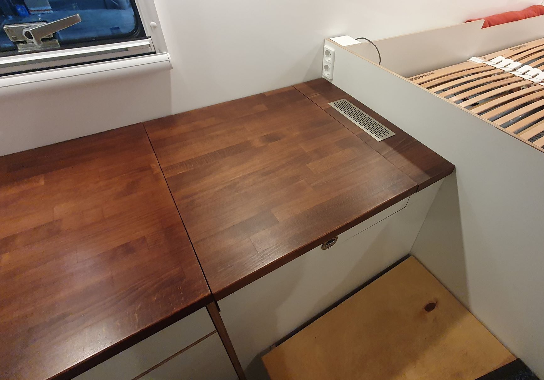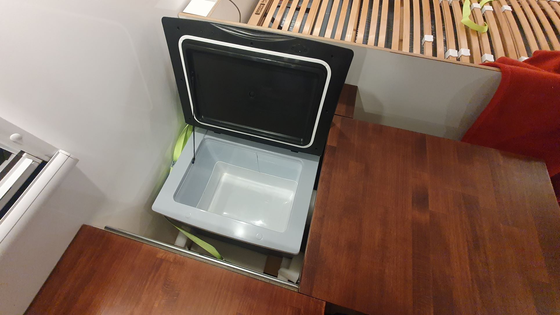 Was, wenn man wirklich lange autark stehen möchte, aber trotzdem frisch kochen will? Man braucht einen großen Kühlschrank. Man braucht aber nicht immer einen riesigen Kühlschrank. Also, was ist die passenden Größe? Wir haben uns für einen 130l-Kühlschrank (inkl. 10l Gefrierfach) entschieden. Zusätzlich haben wir eine 40l-Kompressorkühlbox in die Küche integriert. Die Box kann bis -18 Grad Celsius kühlen. Sie kann gefrorene Lebensmittel tiefgekühlt halten. Ich hatte mal versucht, einen Liter handwarmes Wasser einzufrieren. Das hat mir zu lange gedauert. Daher nur die Beschreibung „kann Tiefgekühltes weiter tiefgekühlt halten“. Bislang haben wir sie aber nur als zusätzliches Kühlfach für Bier und Gemüse genutzt. Um die 7 Grad ist für beides okay.