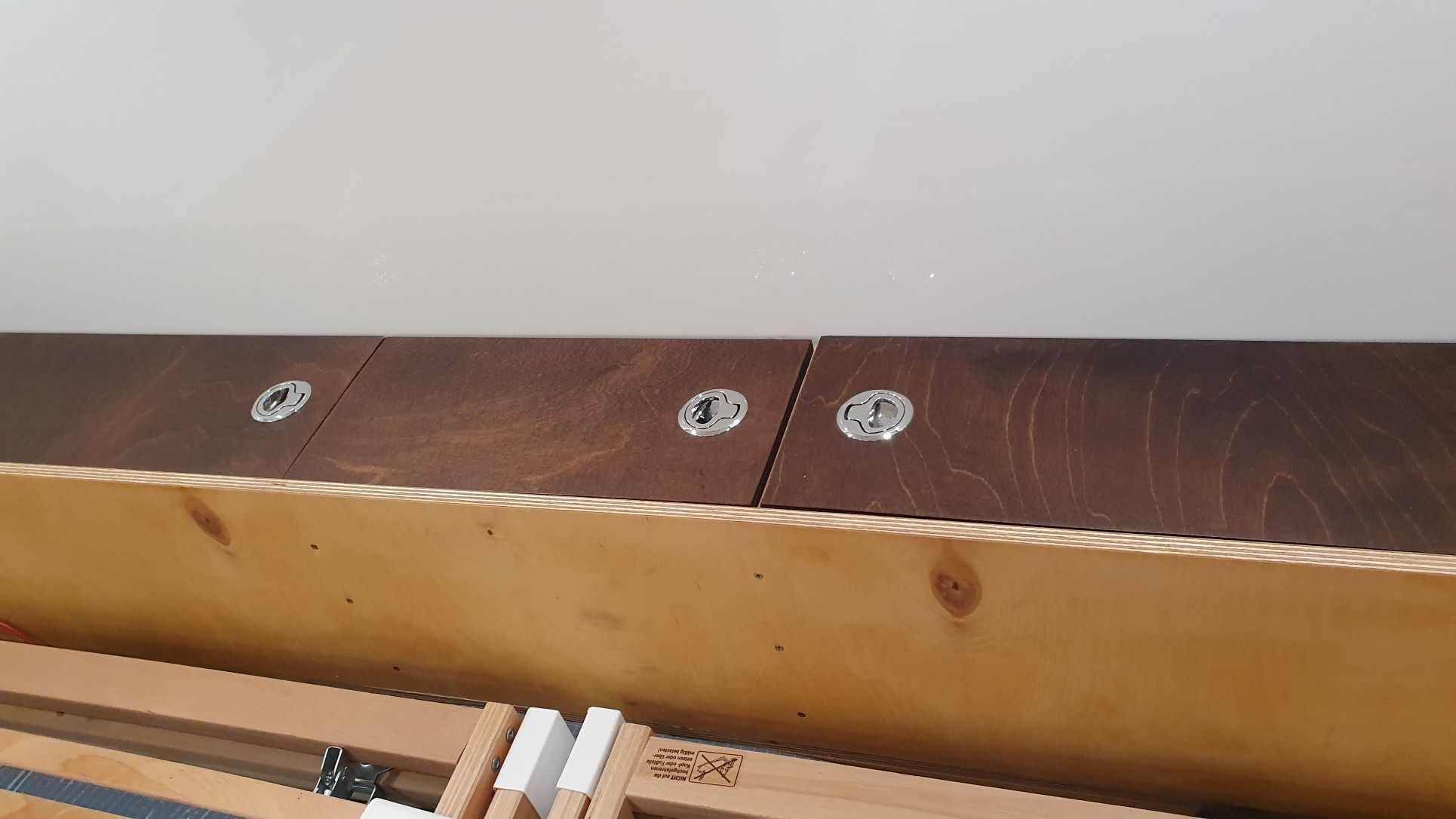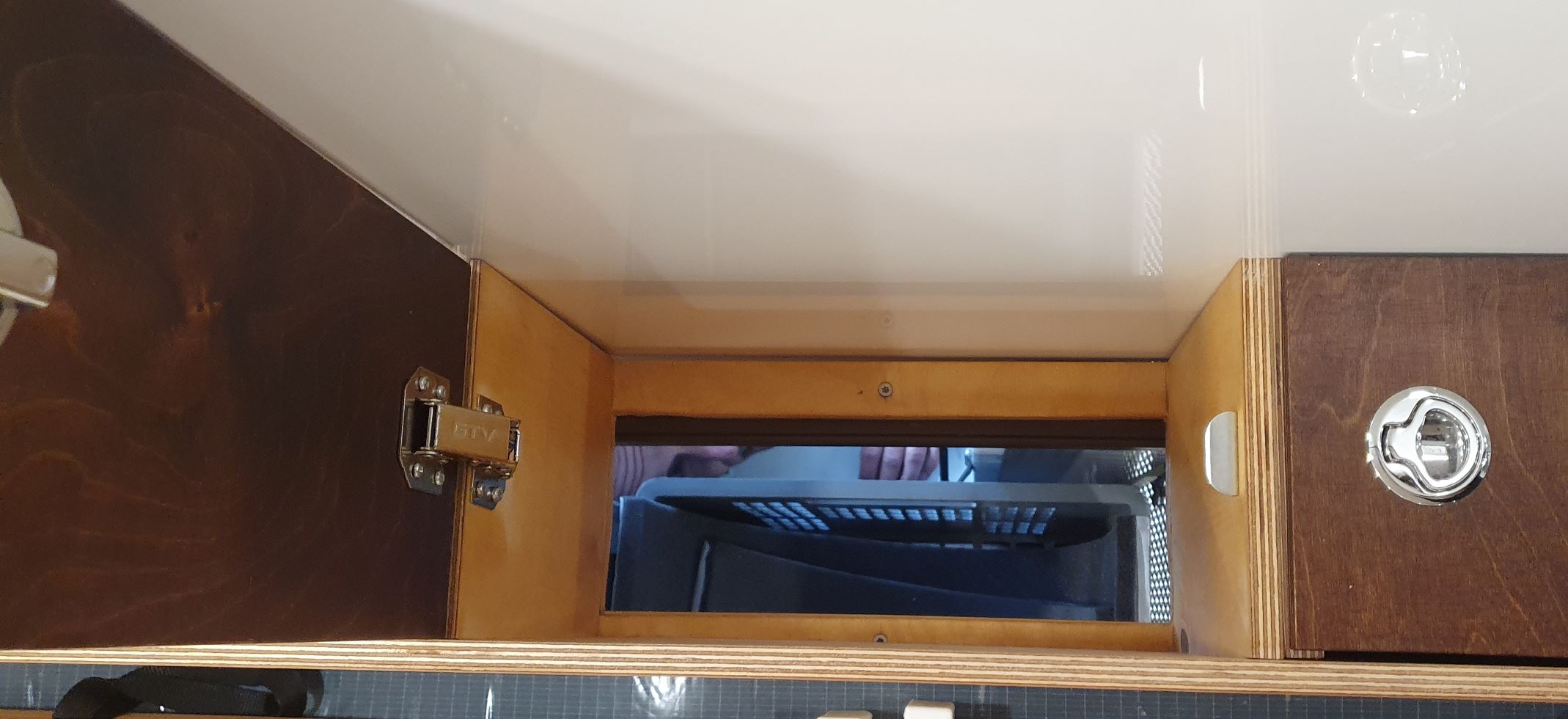 Hier nochmals ein Dankeschön an meine Nichte (talentierte Industriemechanikerin), die uns eine Woche beim Ausbau unterstütz hat. Von ihr habe ich diesen Trick: Bei der Justage der Klappen- und Türverschlüsse (Schnapper hakt in Riegel ein), war ich mir nie ganz sicher, wie hoch ich den Riegel positionieren muss und wie gut der Schnapper einhakt. Meine Nichte spontan: „Stell doch das Handy rein und mach ein Video.“ Okay, eigentlich eine einfache Lösung. Aber ich muss zugeben, ich bin nicht alleine drauf gekommen. Und – siehe Bild aus dem Video – es klappt super gut.