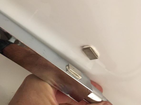 Magnete sind wie kleine Helferlein. Damit unsere Badtüre während der Fahrt nicht klappert, habe ich oben einen Magneten verbaut und auf der Gegenseite eine Schraube. Der Abstand der Schraube zum Magneten lässt sich mittels Mutter und Kontermutter in der Länge verstellen, zur Justierung. Die Türe hat ungefähr mittig den normalen Verschluss. Unten liegt die Türe an.