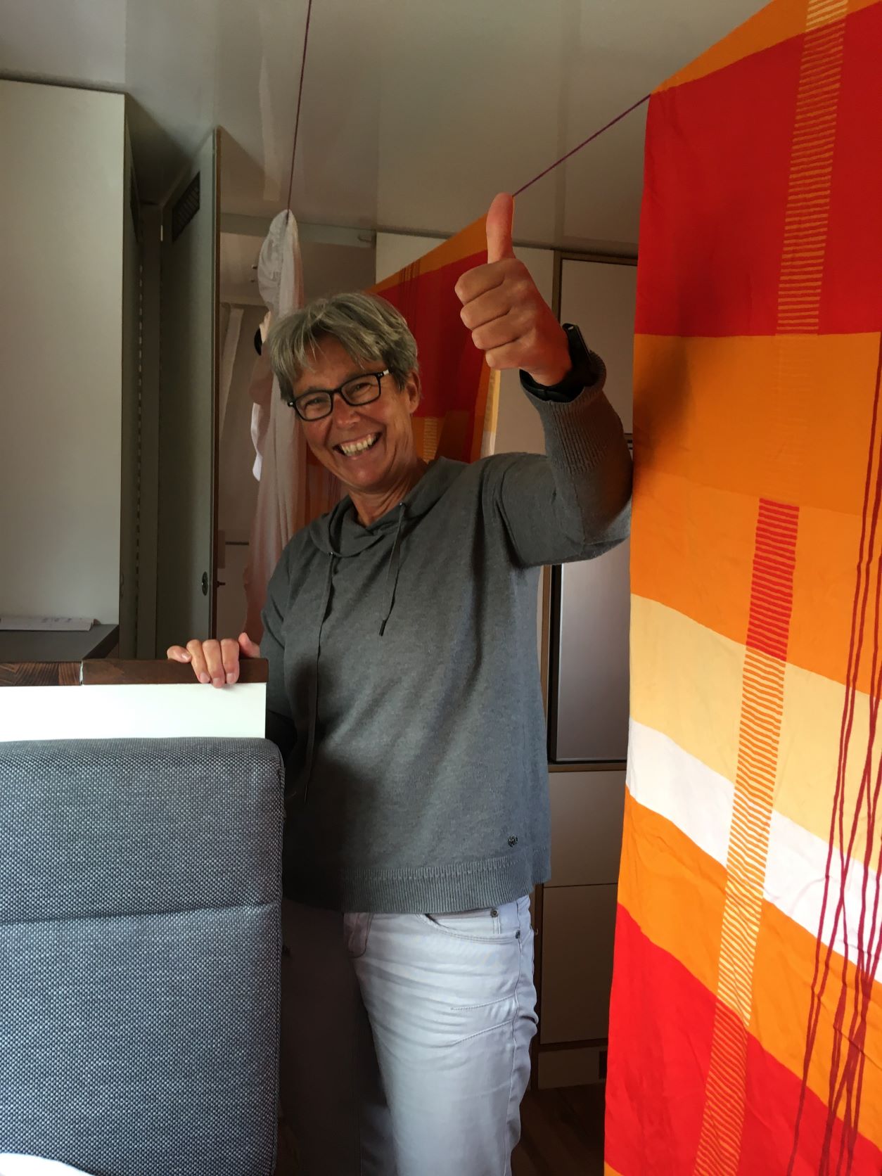 Wer kennt das nicht: Ein Teil der Wäsche müsste mal wieder gewaschen werden, aber draußen ist kein Wetter zum Trocknen und im Waschsalon funktioniert der Trockner nicht bzw. es gibt keinen. Wir spannen dann eine Leine von einem bis zum anderen Ende der Kabine, die ganzen knapp 5,5m. Hin und zurück haben wir dann knapp 11m Leine. Wir haben aber keine fixen Befestigungspunkte in der Kabine sondern nutzen große Saugnäpfe die super an der GFK-Innenseite „kleben“. Die Saugnäpfe hatten wir eigentlich zur Befestigung unseres Sonnensegels außen an der Kabine mitgenommen. Eine Lösung, aus der Notwendigkeit heraus geboren.