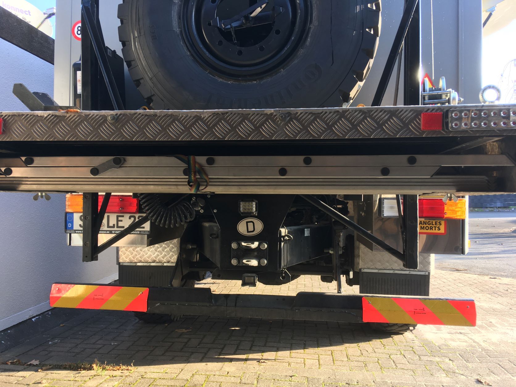 Das Motorrad muss auf alle Fälle mit. Daher brauchten wir auch einen Träger dafür. Da hatte ich aber die Vorgabe: Der darf nicht zu groß aussehen. Nun gut, dann mussten wir ihn eben so klein und unauffällig wie möglich bauen. Das Reserverad wurde auf den etwas länger gezogenen Zwischenrahmen positioniert und belastet daher den Träger insbesondere in dynamischen Geländesituationen nicht. Was wiederum bedeutet, der Träger konnte kleiner ausgelegt werden. Neben dem Motorrad brauchten wir allerdings am Fahrzeug noch Platz für die Sandbleche (schwere Ausführung) und unsere Leiter der Einstiegsplattform. Lösung: wir haben die Plattform des Trägers zweifach gekantet und können jetzt Sandbleche und Leiter unter das Motorrad schieben. Auf eine elektrische Winde haben wir verzichtet. Eine mechanische scheint uns robuster und weniger störanfällig. Das heißt aber nicht, dass wir jetzt immer per Hand runter- und hochkurbeln müssen. Wir haben einen Akkuschrauber an Bord! Damit klappt das wunderbar.