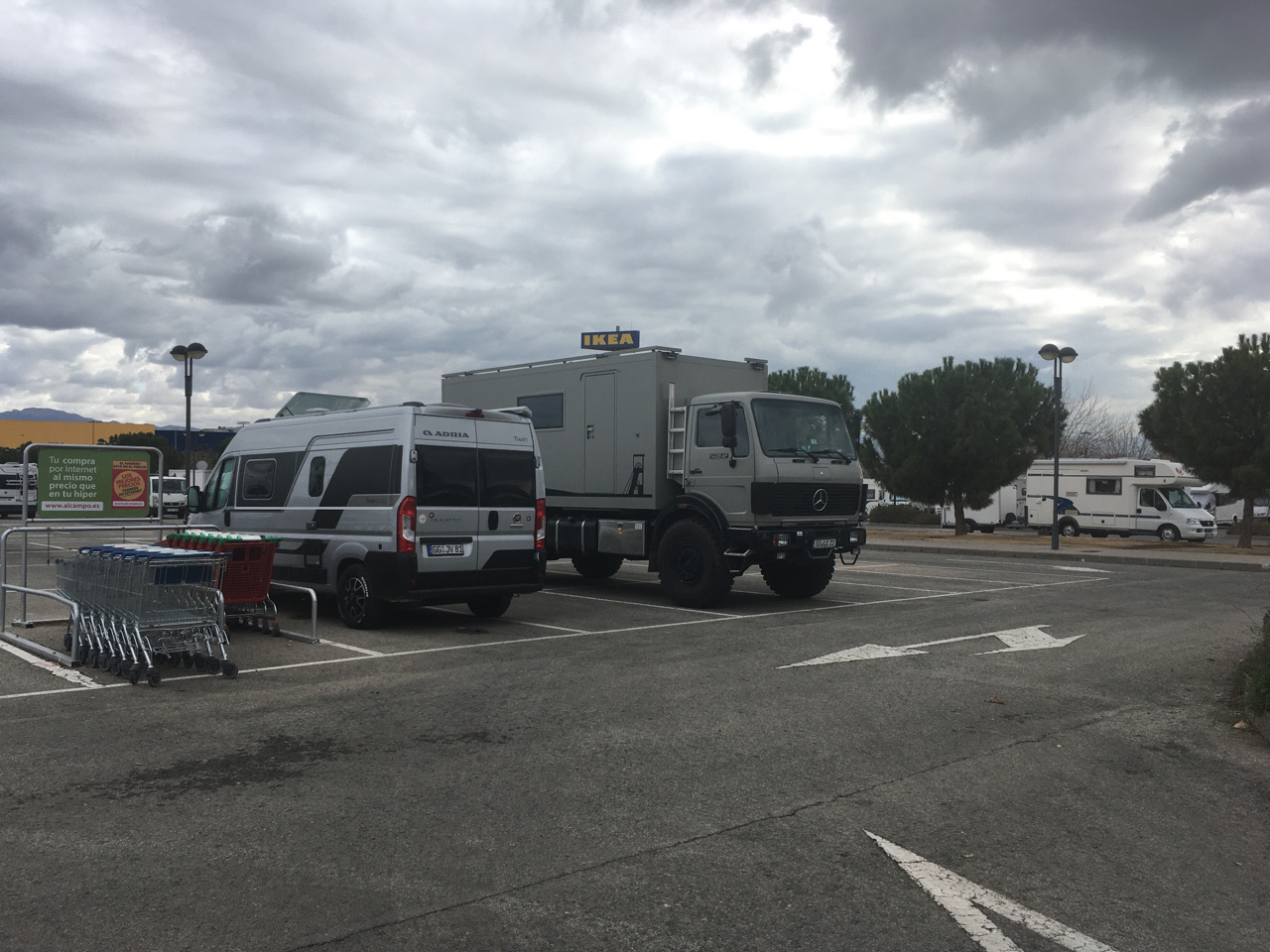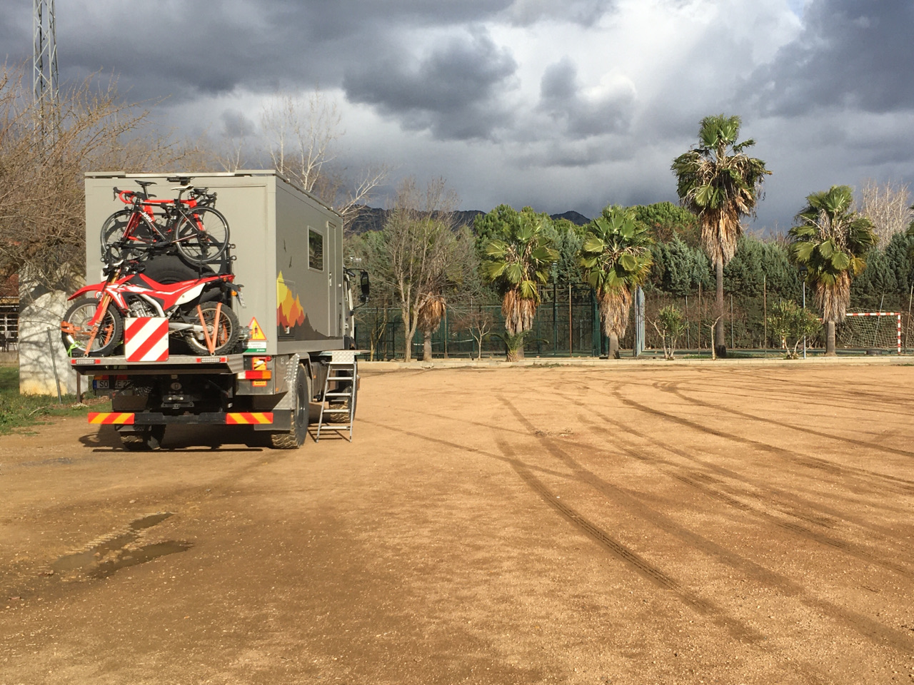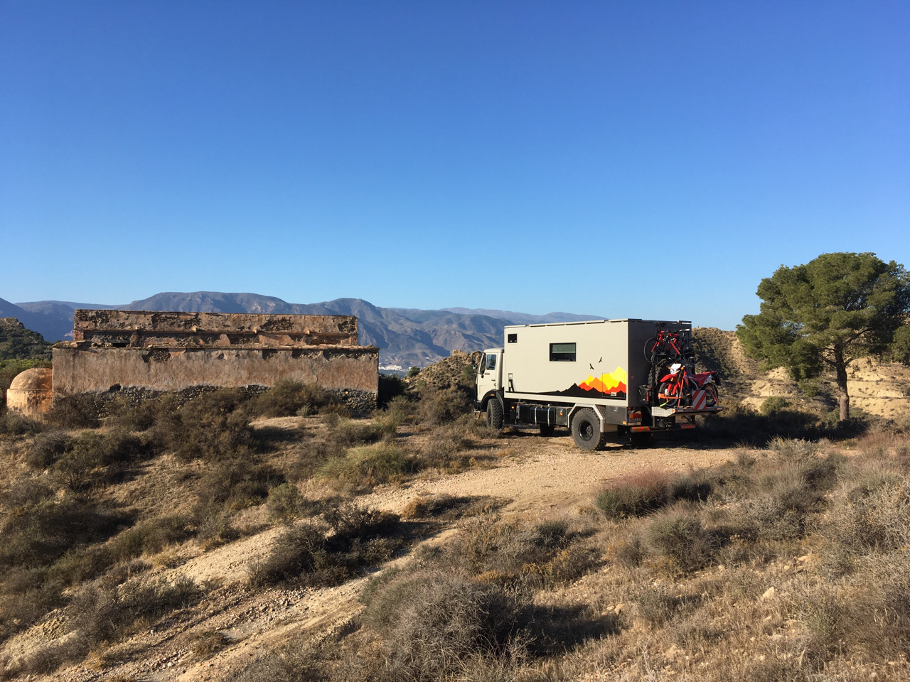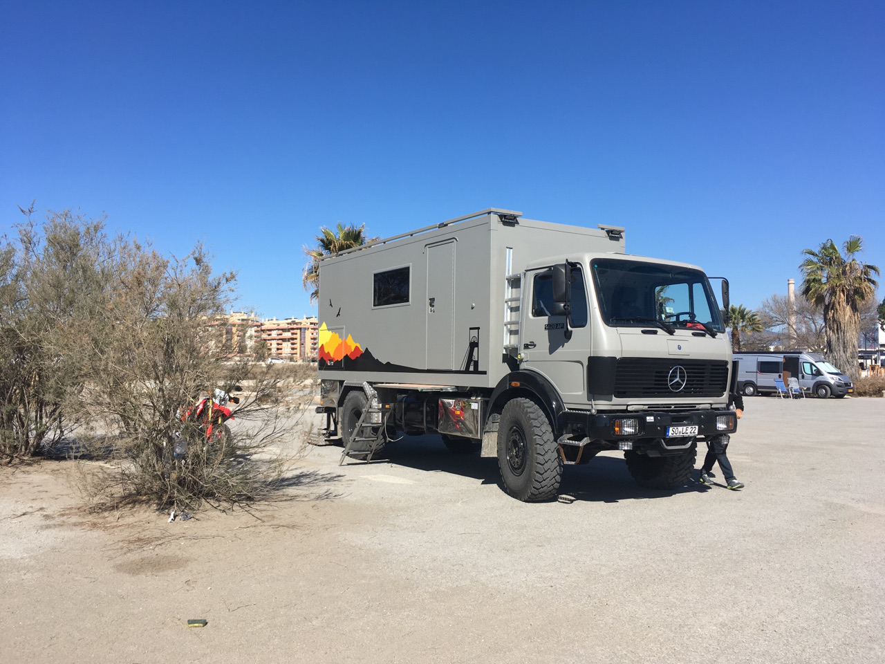 Spanien – Gutes Essen, toller Wein, Sonne und freundliche entspannte Menschen.Wir starten erste einmal im nassen und grauen Aachen, parken über Nacht am Wochenende im Industriegebiet. Näher an die City kamen wir nicht ran – alles Umweltzone.Nach langer Fahrt hatten wir einen sehr schöner und erholsamer Nachmittag in der Keidel Therme in Nähe von Freiburg. Praktischerweise parken wir direkt daneben und haben einen schönen und sehr ruhigen Stellplatz für die NachtTotwinkelaufkleber, in Frankreich Pflicht für uns, haben wir vor der Grenze angeheftet.Nach einer sehr kalten und nebeligen Fahrt am Morgen sind wir nun in Südfrankreich am Mittelmeer angekommen. Ein Stellplatz direkt am Meer inklusive 😎. Wir beschließen noch einen Tag zu bleiben und den nächsten Tag für einen Joggingrunde und einen Strandspaziergang zu nutzen.Nach unzähligen Kreisverkehren und Kurven an der Küste entlang sind wir in Spanien eingetroffen. Auch hier in Nordkatalonien ist es heftig stürmisch und eisig kalt. Aber – die Sonne scheint den ganzen Tag 😎In Peñiscola ist es schon deutlich wärmer und es herrscht nicht so ein rauer Wind. Ein ruhiger und windgeschützter Stellplatz war auch vorhanden. Am nächsten Tag haben wir uns in Peñiscola ein paar alte Steine angesehenDa im Moment das Wetter nicht so gut ist, haben wir die Küste verlassen und haben uns Murcia angesehen. Die Parkgelegenheit ist diese mal nicht schön, aber praktisch und kostenlos. Es ist unglaublich wie viele andere Wohnmobile hier ebenfalls parken. Es sind bestimmt 80-100 😱. Für eine Nacht und um sich die Stadt anzusehen ist es ausreichend.Mirrardor Barrancos de Gebas – ein schöner Stellplatz und wir waren die ganze Zeit alleine. Das hatte aber auch einen Grund: Die Anfahrt war ein kleines Abenteuer. Es hatte die Tage zuvor geregnet und der Schotterweg war mit einer schlammigen Tonerde überzogen, die im Profil klebte, einfach nur klebte. Und dann mit 12t steil bergab auf einem 3 Meter breitem Weg. Augen auf und durch!Wir sind dort auch gewandert. Und hier erkennt man: dies Zeug fiel nicht mal von den Wanderschuhen ab.Probieren geht über Studieren. Wir hatten so viel und auch so unterschiedliches von diesem Ort gehört und wollten uns selbst ein Bild machen. – Playa de Percheles (Schlangenbucht)- aber nur aus dieser Perspektive schön. Wir standen ganz oben auf dem Felsen. Traumhafte Aussicht aufs Meer. Der Blick in die andere Richtung: Camper, gaaanz viele deutsche Camper. Aber wir haben nette Leute getroffen.Schlangenbucht Foto 1 für Instagram.Schlangenbucht Foto 2 für InstagramSchlangenbucht aus einer Nicht-Instagram-PerspektiveNach ein paar herrlichen Tagen am Playa Pecheles ging es heute weiter Richtung Almería. Auf dem Weg haben wir einmal eine notwendige LKW Wäsche gemacht, um das ganze Salz zu entfernen.Im Naturschutzgebiet Cabo de Gata haben wir uns mal zur Abwechslung einen richtigen Campingplatz gesucht. Ein bisschen quer reingestellt aber Länge und Höhe waren ausreichend. Der Balken über dem Dach hatte einen ziemlich harten Schatten geworfen, so dass wir sehr wenig Solareinspeisung hatten, trotz toller Sonne.Der Campingplatz ist schön und sehr gepflegt und hat den großen Vorteil, dass man ordentlich Wäsche waschen kann 😀 Heute stand eine ziemlich lange aber sehr schöne Wanderung nach San José auf dem Programm. Hin an der Küste entlang und zurück durch das Hinterland.Auf dem Weg nach Almería haben wir noch eine Besichtigungstour in die ehemaligen Minen gemacht. Nach einer netten Schotterstrecke konnten wir in der Nähe der Minen parken. Na, wer kennt diese Kulisse noch? – Kultfilm der 80’ger. Da mussten wir anhalten. Das ging nicht anders. Must-Have-Photo!In Almería ist es tagsüber so warm, dass man fast vergessen kann, dass es eigentlich erst Februar ist. Almería hat zwar keine nennenswerten Sehenswürdigkeiten, aber dafür lässt es sich hier ganz hervorragend leben.Heute haben wir den Tag zu einer Radtour zu den Salinas genutzt und ein paar Flamingos in der Ferne gesehen. Markttag, eine Portion Churros durfte dabei nicht fehlen. Und obwohl wir schon Wochen in diesen Land sind, sind wir genau jetzt -wirklich und endlich- „in Spanien angekommen“.Nach den entspannten Tagen am Meer zieht es uns jetzt wieder in die Berge. Wir sind noch einen Tag hier geblieben, da die sehr schöne und ganz wenig befahrene Straße uns geradezu dazu eingeladen hat, sie mal hoch und runter zu fahren – mit dem Radl. Schön wars.Trevélez Nach einer sehr schönen, aber auch anstrengenden Panoramafahrt durch die Höhen der Alpujarras sind wir im höchsten Dorf Spaniens auf 1500m in der Sierra Nevada angekommen. Wir hatten uns zu anderen Campern auf den Marktplatz gestellt. Als wir aus der Stadt zurück kamen, waren alle weg. Fragezeichen in unseren Gesichtern. Aber dann haben wir mal auf die Schilder geschaut 🙂 Nächster Tag: Markttag ab 08:00 Uhr. Okay, wenn in Deutschland ab 8 Uhr Markt ist, werden die Stände bereits um 5:30 aufgestellt. Ich kennen das, habe früher meinem Onkel öfter geholfen. Aber in Spanien? Wir sind einfach früh aufgestanden und so gegen 7:15Uhr abgefahren. Da wurde gerade der erste Stand aufgebaut.Nach dem eisigen Trevélez freuen wir uns nun auf das etwas wärmere und berühmte Granada. In der Nähe von Städten sind Campingplätze praktisch, meist zentral und gut erreichbar gelegen, bieten Sicherheit und Infrastruktur. Klasse als Startpunkt für die Stadtbesichtigungen. Und zur Stadtbesichtigung mitten in die City geht’s mit dem Motorrad. In Spanien ideal. Da kann man direkt neben den wichtigsten Sehenswürdigkeiten und Lokalen parken.Heute ging es bei bestem Wetter zur Alhambra und nach Granada. Sooo sehenswert und schön. Nachmittags besuchten wir noch einmal das wunderschöne und quirlige Granada. Nur die vielen Einbahnstraßen machten es nicht unbedingt übersichtlich und die Navisoftware im Handy zeigt einem ja auch nur 1. die Routen für’s Auto und 2. nur 