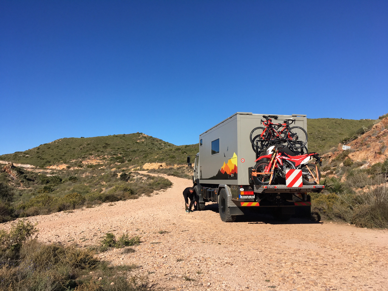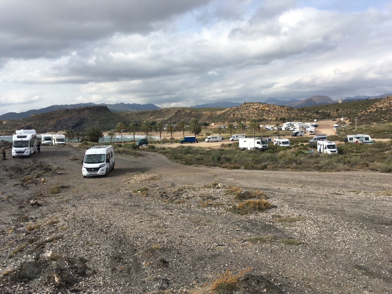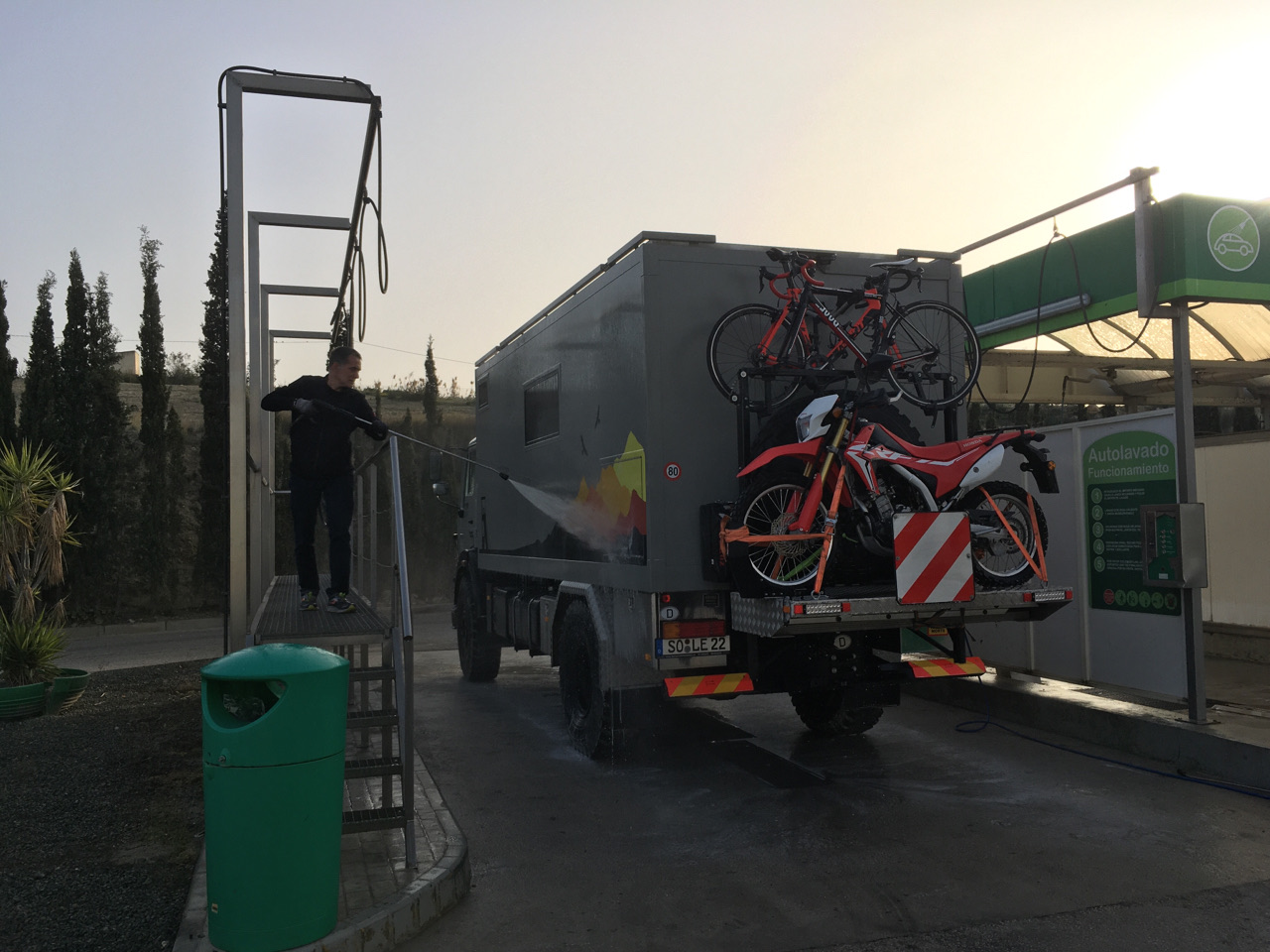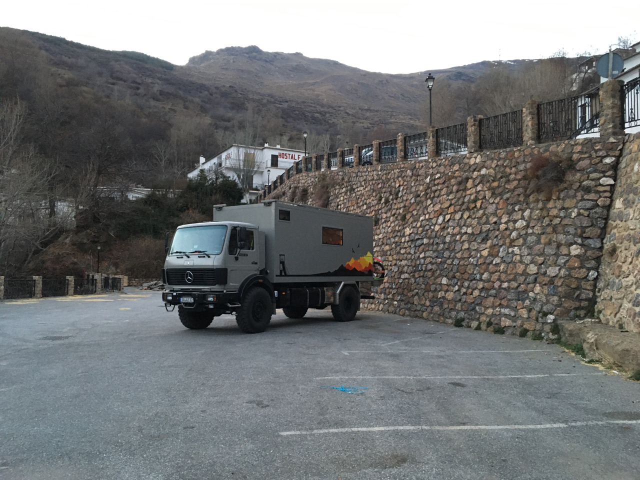 Spanien – Gutes Essen, toller Wein, Sonne und freundliche entspannte Menschen.Wir starten erste einmal im nassen und grauen Aachen, parken über Nacht am Wochenende im Industriegebiet. Näher an die City kamen wir nicht ran – alles Umweltzone.Nach langer Fahrt hatten wir einen sehr schöner und erholsamer Nachmittag in der Keidel Therme in Nähe von Freiburg. Praktischerweise parken wir direkt daneben und haben einen schönen und sehr ruhigen Stellplatz für die NachtTotwinkelaufkleber, in Frankreich Pflicht für uns, haben wir vor der Grenze angeheftet.Nach einer sehr kalten und nebeligen Fahrt am Morgen sind wir nun in Südfrankreich am Mittelmeer angekommen. Ein Stellplatz direkt am Meer inklusive 😎. Wir beschließen noch einen Tag zu bleiben und den nächsten Tag für einen Joggingrunde und einen Strandspaziergang zu nutzen.Nach unzähligen Kreisverkehren und Kurven an der Küste entlang sind wir in Spanien eingetroffen. Auch hier in Nordkatalonien ist es heftig stürmisch und eisig kalt. Aber – die Sonne scheint den ganzen Tag 😎In Peñiscola ist es schon deutlich wärmer und es herrscht nicht so ein rauer Wind. Ein ruhiger und windgeschützter Stellplatz war auch vorhanden. Am nächsten Tag haben wir uns in Peñiscola ein paar alte Steine angesehenDa im Moment das Wetter nicht so gut ist, haben wir die Küste verlassen und haben uns Murcia angesehen. Die Parkgelegenheit ist diese mal nicht schön, aber praktisch und kostenlos. Es ist unglaublich wie viele andere Wohnmobile hier ebenfalls parken. Es sind bestimmt 80-100 😱. Für eine Nacht und um sich die Stadt anzusehen ist es ausreichend.Mirrardor Barrancos de Gebas – ein schöner Stellplatz und wir waren die ganze Zeit alleine. Das hatte aber auch einen Grund: Die Anfahrt war ein kleines Abenteuer. Es hatte die Tage zuvor geregnet und der Schotterweg war mit einer schlammigen Tonerde überzogen, die im Profil klebte, einfach nur klebte. Und dann mit 12t steil bergab auf einem 3 Meter breitem Weg. Augen auf und durch!Wir sind dort auch gewandert. Und hier erkennt man: dies Zeug fiel nicht mal von den Wanderschuhen ab.Probieren geht über Studieren. Wir hatten so viel und auch so unterschiedliches von diesem Ort gehört und wollten uns selbst ein Bild machen. – Playa de Percheles (Schlangenbucht)- aber nur aus dieser Perspektive schön. Wir standen ganz oben auf dem Felsen. Traumhafte Aussicht aufs Meer. Der Blick in die andere Richtung: Camper, gaaanz viele deutsche Camper. Aber wir haben nette Leute getroffen.Schlangenbucht Foto 1 für Instagram.Schlangenbucht Foto 2 für InstagramSchlangenbucht aus einer Nicht-Instagram-PerspektiveNach ein paar herrlichen Tagen am Playa Pecheles ging es heute weiter Richtung Almería. Auf dem Weg haben wir einmal eine notwendige LKW Wäsche gemacht, um das ganze Salz zu entfernen.Im Naturschutzgebiet Cabo de Gata haben wir uns mal zur Abwechslung einen richtigen Campingplatz gesucht. Ein bisschen quer reingestellt aber Länge und Höhe waren ausreichend. Der Balken über dem Dach hatte einen ziemlich harten Schatten geworfen, so dass wir sehr wenig Solareinspeisung hatten, trotz toller Sonne.Der Campingplatz ist schön und sehr gepflegt und hat den großen Vorteil, dass man ordentlich Wäsche waschen kann 😀 Heute stand eine ziemlich lange aber sehr schöne Wanderung nach San José auf dem Programm. Hin an der Küste entlang und zurück durch das Hinterland.Auf dem Weg nach Almería haben wir noch eine Besichtigungstour in die ehemaligen Minen gemacht. Nach einer netten Schotterstrecke konnten wir in der Nähe der Minen parken. Na, wer kennt diese Kulisse noch? – Kultfilm der 80’ger. Da mussten wir anhalten. Das ging nicht anders. Must-Have-Photo!In Almería ist es tagsüber so warm, dass man fast vergessen kann, dass es eigentlich erst Februar ist. Almería hat zwar keine nennenswerten Sehenswürdigkeiten, aber dafür lässt es sich hier ganz hervorragend leben.Heute haben wir den Tag zu einer Radtour zu den Salinas genutzt und ein paar Flamingos in der Ferne gesehen. Markttag, eine Portion Churros durfte dabei nicht fehlen. Und obwohl wir schon Wochen in diesen Land sind, sind wir genau jetzt -wirklich und endlich- „in Spanien angekommen“.Nach den entspannten Tagen am Meer zieht es uns jetzt wieder in die Berge. Wir sind noch einen Tag hier geblieben, da die sehr schöne und ganz wenig befahrene Straße uns geradezu dazu eingeladen hat, sie mal hoch und runter zu fahren – mit dem Radl. Schön wars.Trevélez Nach einer sehr schönen, aber auch anstrengenden Panoramafahrt durch die Höhen der Alpujarras sind wir im höchsten Dorf Spaniens auf 1500m in der Sierra Nevada angekommen. Wir hatten uns zu anderen Campern auf den Marktplatz gestellt. Als wir aus der Stadt zurück kamen, waren alle weg. Fragezeichen in unseren Gesichtern. Aber dann haben wir mal auf die Schilder geschaut 🙂 Nächster Tag: Markttag ab 08:00 Uhr. Okay, wenn in Deutschland ab 8 Uhr Markt ist, werden die Stände bereits um 5:30 aufgestellt. Ich kennen das, habe früher meinem Onkel öfter geholfen. Aber in Spanien? Wir sind einfach früh aufgestanden und so gegen 7:15Uhr abgefahren. Da wurde gerade der erste Stand aufgebaut.Nach dem eisigen Trevélez freuen wir uns nun auf das etwas wärmere und berühmte Granada. In der Nähe von Städten sind Campingplätze praktisch, meist zentral und gut erreichbar gelegen, bieten Sicherheit und Infrastruktur. Klasse als Startpunkt für die Stadtbesichtigungen. Und zur Stadtbesichtigung mitten in die City geht’s mit dem Motorrad. In Spanien ideal. Da kann man direkt neben den wichtigsten Sehenswürdigkeiten und Lokalen parken.Heute ging es bei bestem Wetter zur Alhambra und nach Granada. Sooo sehenswert und schön. Nachmittags besuchten wir noch einmal das wunderschöne und quirlige Granada. Nur die vielen Einbahnstraßen machten es nicht unbedingt übersichtlich und die Navisoftware im Handy zeigt einem ja auch nur 1. die Routen für’s Auto und 2. nur 