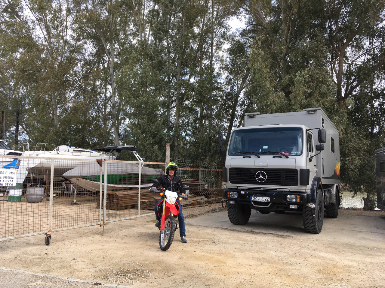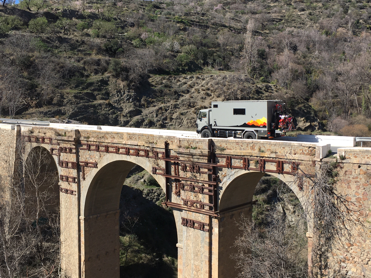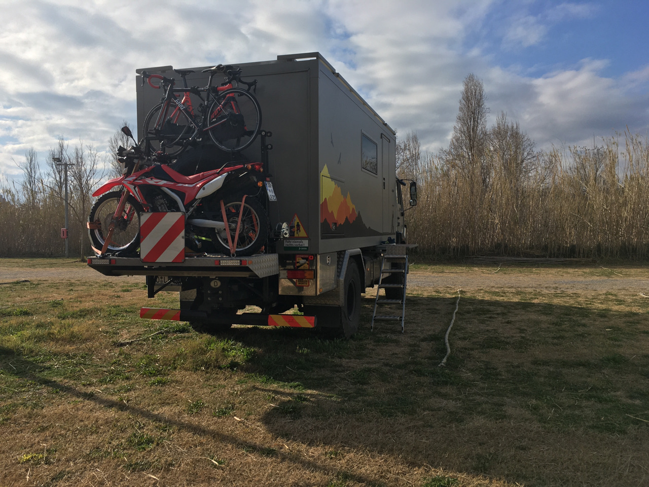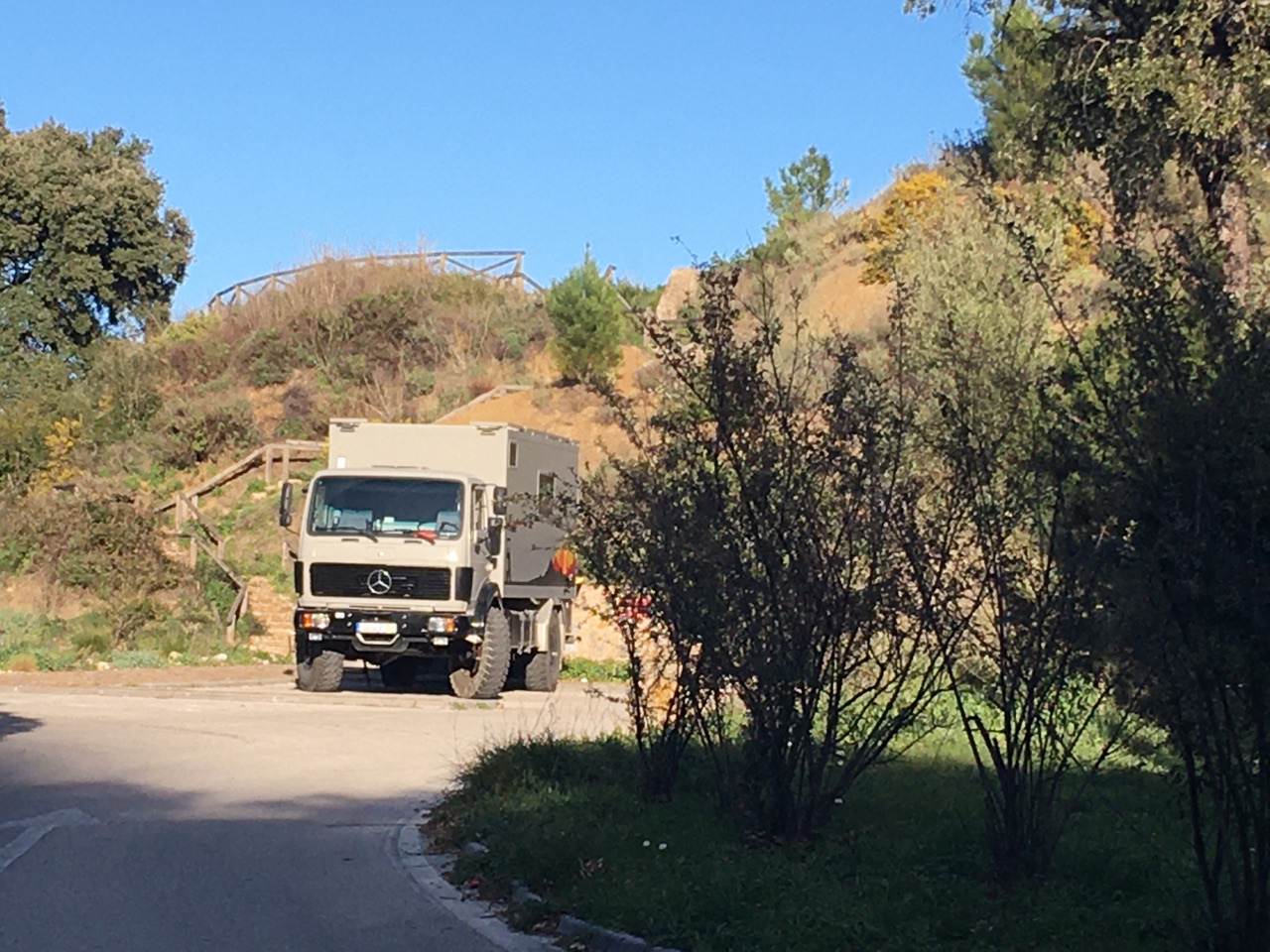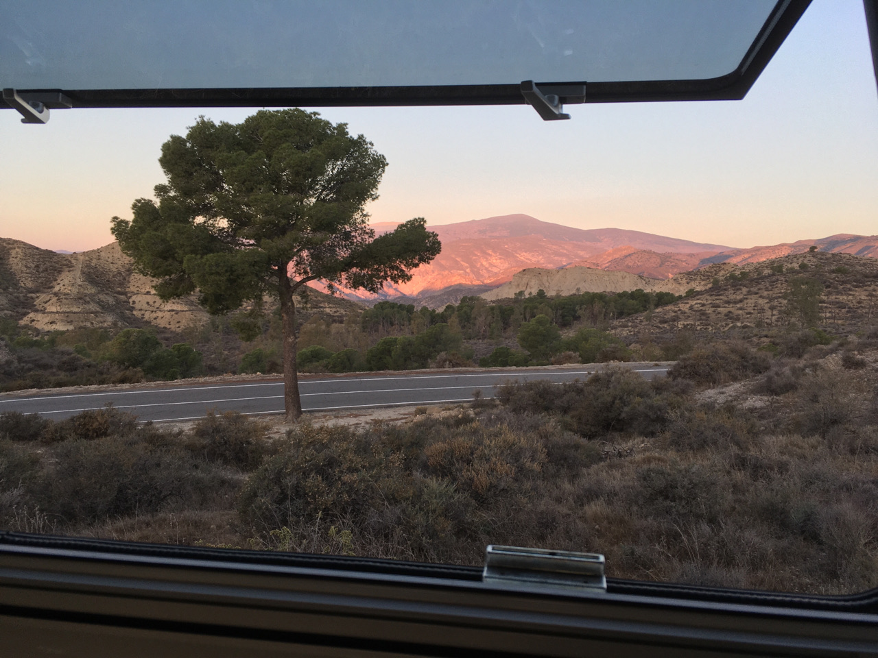 Spanien – Gutes Essen, toller Wein, Sonne und freundliche entspannte Menschen.Wir starten erste einmal im nassen und grauen Aachen, parken über Nacht am Wochenende im Industriegebiet. Näher an die City kamen wir nicht ran – alles Umweltzone.Nach langer Fahrt hatten wir einen sehr schöner und erholsamer Nachmittag in der Keidel Therme in Nähe von Freiburg. Praktischerweise parken wir direkt daneben und haben einen schönen und sehr ruhigen Stellplatz für die NachtTotwinkelaufkleber, in Frankreich Pflicht für uns, haben wir vor der Grenze angeheftet.Nach einer sehr kalten und nebeligen Fahrt am Morgen sind wir nun in Südfrankreich am Mittelmeer angekommen. Ein Stellplatz direkt am Meer inklusive 😎. Wir beschließen noch einen Tag zu bleiben und den nächsten Tag für einen Joggingrunde und einen Strandspaziergang zu nutzen.Nach unzähligen Kreisverkehren und Kurven an der Küste entlang sind wir in Spanien eingetroffen. Auch hier in Nordkatalonien ist es heftig stürmisch und eisig kalt. Aber – die Sonne scheint den ganzen Tag 😎In Peñiscola ist es schon deutlich wärmer und es herrscht nicht so ein rauer Wind. Ein ruhiger und windgeschützter Stellplatz war auch vorhanden. Am nächsten Tag haben wir uns in Peñiscola ein paar alte Steine angesehenDa im Moment das Wetter nicht so gut ist, haben wir die Küste verlassen und haben uns Murcia angesehen. Die Parkgelegenheit ist diese mal nicht schön, aber praktisch und kostenlos. Es ist unglaublich wie viele andere Wohnmobile hier ebenfalls parken. Es sind bestimmt 80-100 😱. Für eine Nacht und um sich die Stadt anzusehen ist es ausreichend.Mirrardor Barrancos de Gebas – ein schöner Stellplatz und wir waren die ganze Zeit alleine. Das hatte aber auch einen Grund: Die Anfahrt war ein kleines Abenteuer. Es hatte die Tage zuvor geregnet und der Schotterweg war mit einer schlammigen Tonerde überzogen, die im Profil klebte, einfach nur klebte. Und dann mit 12t steil bergab auf einem 3 Meter breitem Weg. Augen auf und durch!Wir sind dort auch gewandert. Und hier erkennt man: dies Zeug fiel nicht mal von den Wanderschuhen ab.Probieren geht über Studieren. Wir hatten so viel und auch so unterschiedliches von diesem Ort gehört und wollten uns selbst ein Bild machen. – Playa de Percheles (Schlangenbucht)- aber nur aus dieser Perspektive schön. Wir standen ganz oben auf dem Felsen. Traumhafte Aussicht aufs Meer. Der Blick in die andere Richtung: Camper, gaaanz viele deutsche Camper. Aber wir haben nette Leute getroffen.Schlangenbucht Foto 1 für Instagram.Schlangenbucht Foto 2 für InstagramSchlangenbucht aus einer Nicht-Instagram-PerspektiveNach ein paar herrlichen Tagen am Playa Pecheles ging es heute weiter Richtung Almería. Auf dem Weg haben wir einmal eine notwendige LKW Wäsche gemacht, um das ganze Salz zu entfernen.Im Naturschutzgebiet Cabo de Gata haben wir uns mal zur Abwechslung einen richtigen Campingplatz gesucht. Ein bisschen quer reingestellt aber Länge und Höhe waren ausreichend. Der Balken über dem Dach hatte einen ziemlich harten Schatten geworfen, so dass wir sehr wenig Solareinspeisung hatten, trotz toller Sonne.Der Campingplatz ist schön und sehr gepflegt und hat den großen Vorteil, dass man ordentlich Wäsche waschen kann 😀 Heute stand eine ziemlich lange aber sehr schöne Wanderung nach San José auf dem Programm. Hin an der Küste entlang und zurück durch das Hinterland.Auf dem Weg nach Almería haben wir noch eine Besichtigungstour in die ehemaligen Minen gemacht. Nach einer netten Schotterstrecke konnten wir in der Nähe der Minen parken. Na, wer kennt diese Kulisse noch? – Kultfilm der 80’ger. Da mussten wir anhalten. Das ging nicht anders. Must-Have-Photo!In Almería ist es tagsüber so warm, dass man fast vergessen kann, dass es eigentlich erst Februar ist. Almería hat zwar keine nennenswerten Sehenswürdigkeiten, aber dafür lässt es sich hier ganz hervorragend leben.Heute haben wir den Tag zu einer Radtour zu den Salinas genutzt und ein paar Flamingos in der Ferne gesehen. Markttag, eine Portion Churros durfte dabei nicht fehlen. Und obwohl wir schon Wochen in diesen Land sind, sind wir genau jetzt -wirklich und endlich- „in Spanien angekommen“.Nach den entspannten Tagen am Meer zieht es uns jetzt wieder in die Berge. Wir sind noch einen Tag hier geblieben, da die sehr schöne und ganz wenig befahrene Straße uns geradezu dazu eingeladen hat, sie mal hoch und runter zu fahren – mit dem Radl. Schön wars.Trevélez Nach einer sehr schönen, aber auch anstrengenden Panoramafahrt durch die Höhen der Alpujarras sind wir im höchsten Dorf Spaniens auf 1500m in der Sierra Nevada angekommen. Wir hatten uns zu anderen Campern auf den Marktplatz gestellt. Als wir aus der Stadt zurück kamen, waren alle weg. Fragezeichen in unseren Gesichtern. Aber dann haben wir mal auf die Schilder geschaut 🙂 Nächster Tag: Markttag ab 08:00 Uhr. Okay, wenn in Deutschland ab 8 Uhr Markt ist, werden die Stände bereits um 5:30 aufgestellt. Ich kennen das, habe früher meinem Onkel öfter geholfen. Aber in Spanien? Wir sind einfach früh aufgestanden und so gegen 7:15Uhr abgefahren. Da wurde gerade der erste Stand aufgebaut.Nach dem eisigen Trevélez freuen wir uns nun auf das etwas wärmere und berühmte Granada. In der Nähe von Städten sind Campingplätze praktisch, meist zentral und gut erreichbar gelegen, bieten Sicherheit und Infrastruktur. Klasse als Startpunkt für die Stadtbesichtigungen. Und zur Stadtbesichtigung mitten in die City geht’s mit dem Motorrad. In Spanien ideal. Da kann man direkt neben den wichtigsten Sehenswürdigkeiten und Lokalen parken.Heute ging es bei bestem Wetter zur Alhambra und nach Granada. Sooo sehenswert und schön. Nachmittags besuchten wir noch einmal das wunderschöne und quirlige Granada. Nur die vielen Einbahnstraßen machten es nicht unbedingt übersichtlich und die Navisoftware im Handy zeigt einem ja auch nur 1. die Routen für’s Auto und 2. nur 