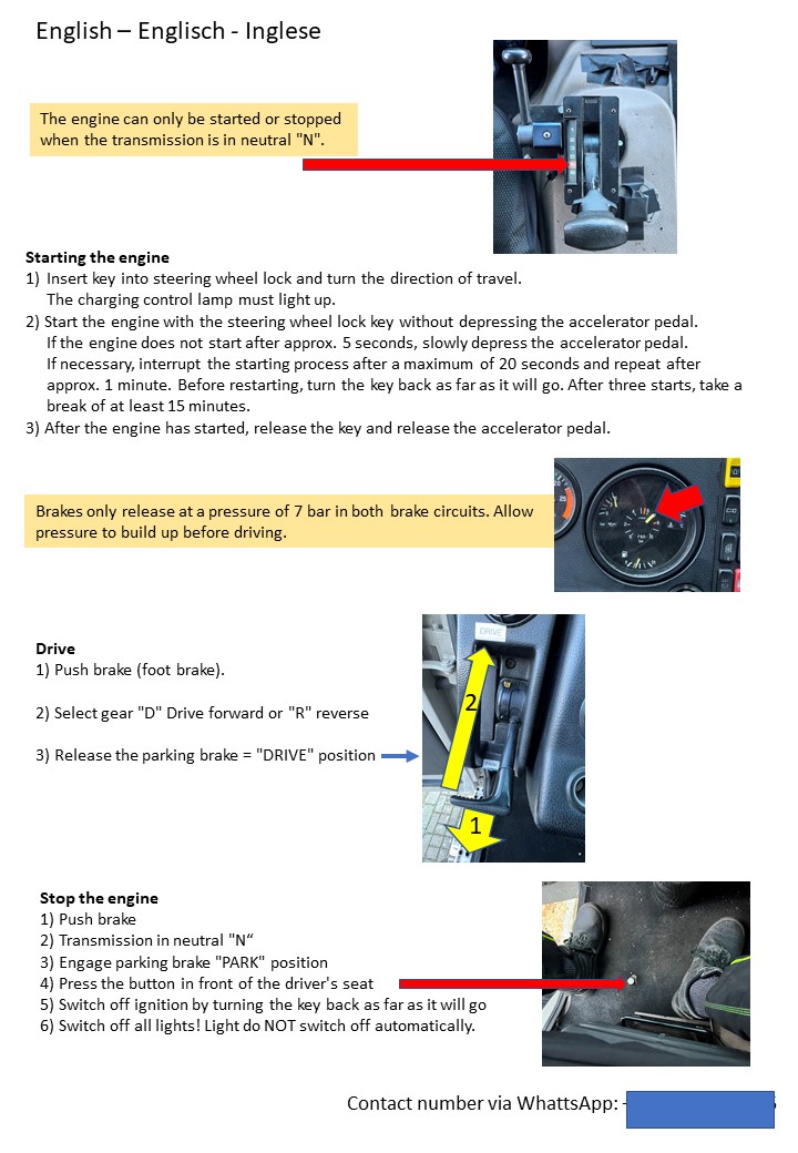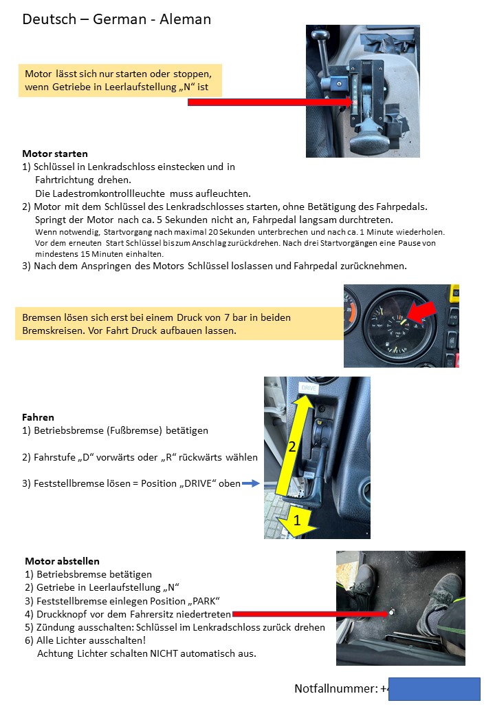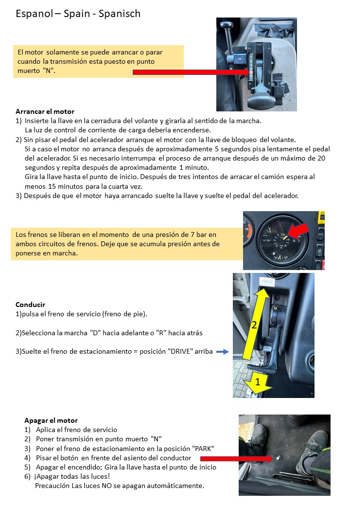 Einen alten LKW zu starten, zu fahren und auch wieder abzustellen ist einfach, dennoch nicht alltäglich. Oft unterscheidet sich die Handhabung älterer Modelle ziemlich von der Neuerer. Also habe ich eine kurze und hoffentlich einfach zu verstehende Anleitung in Deutsch, Englisch und Spanisch gebastelt, die ich bei der Verschiffung ins Fahrerhaus lege.